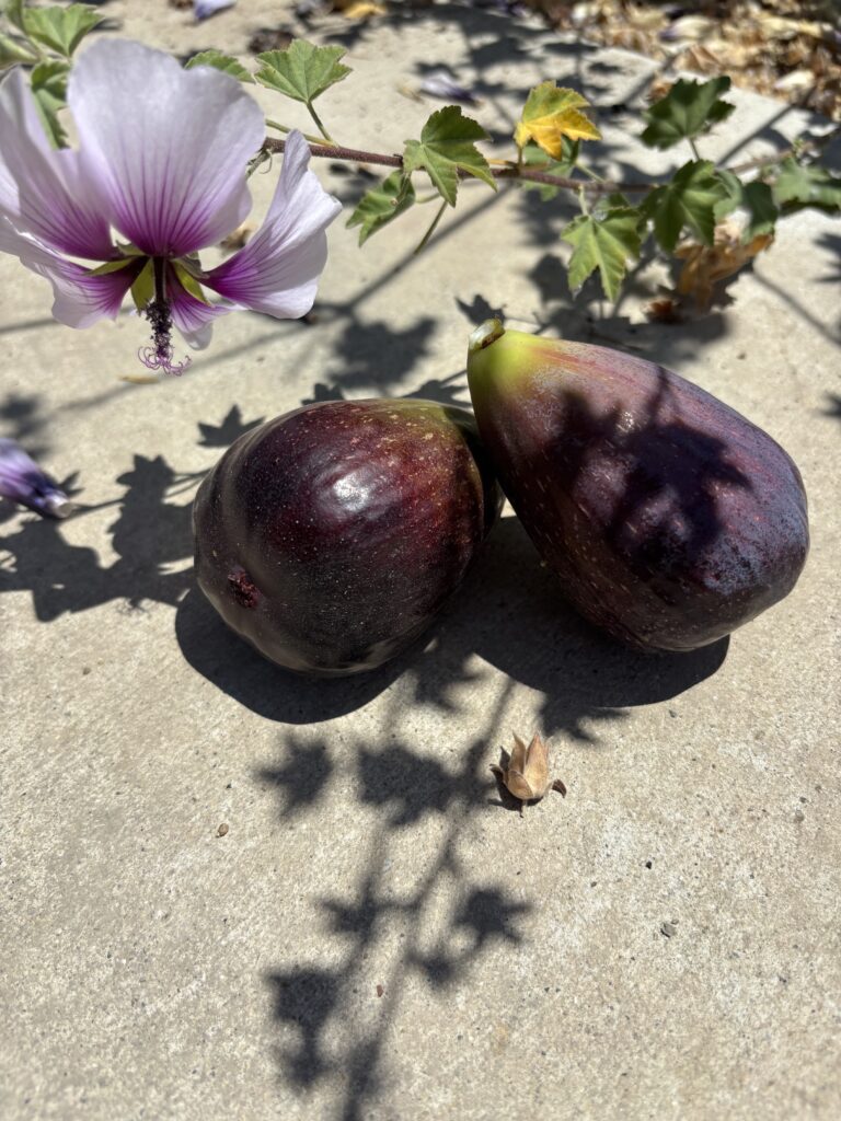 THEN…., my fig tree….my sweet friend who perched right in front of my door. Her beauty made me cry. She is trying. She has broad shiny haphardly spaced leaves and lots of tiny figs that don’t seem to want to grow, but THEN…there, hidden behind one branch, the two most gorgeous ripe majestically purple figs I have ever seen.